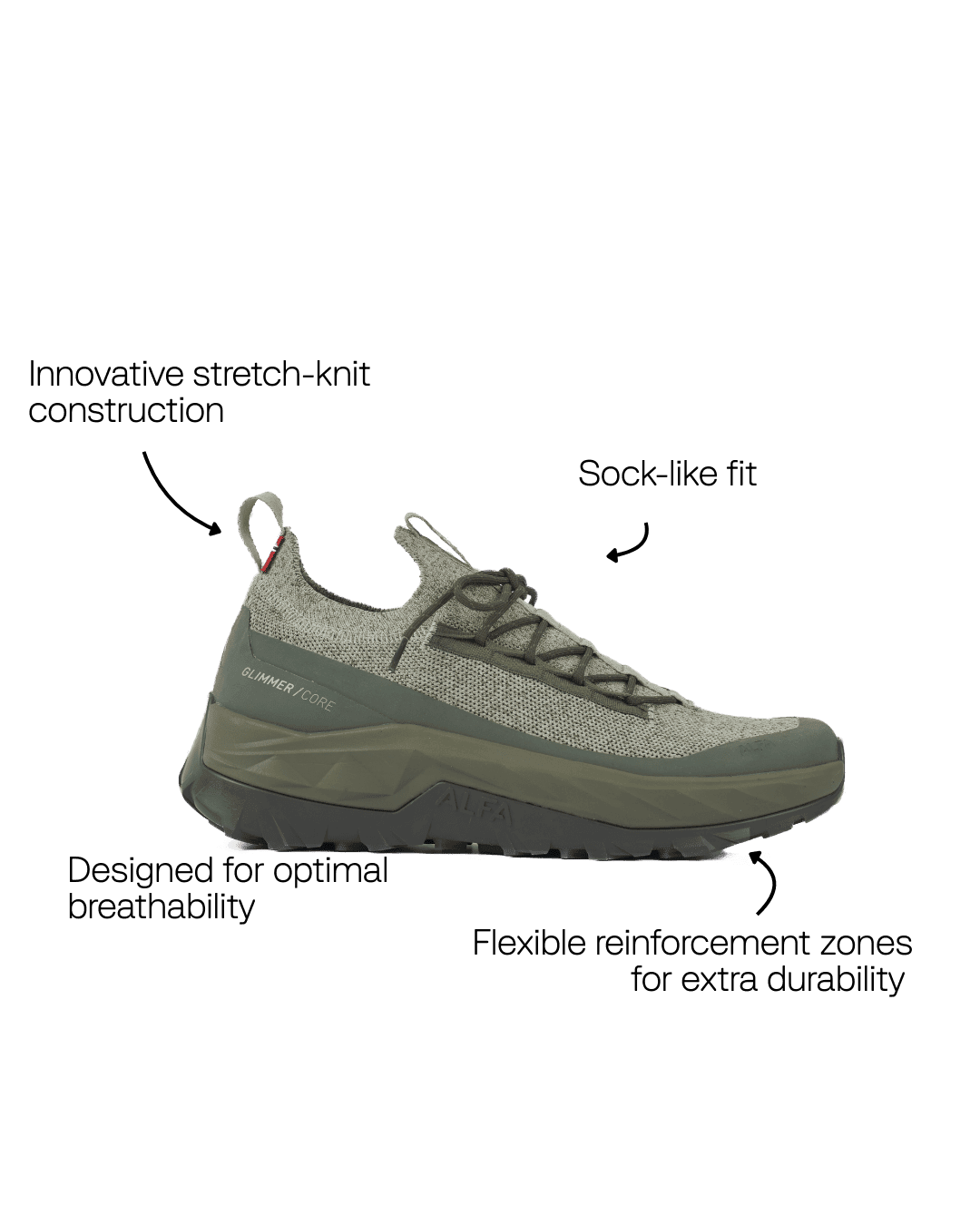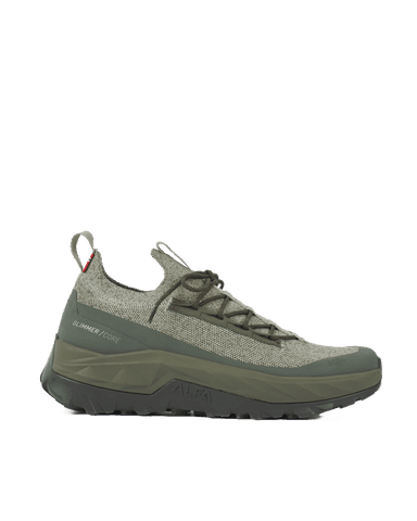 Glimmer is designed for active days where comfort, flexibility, and breathability are essential. Built with an innovative knitted upper, it delivers a sock-like fit that adapts naturally to your foot while maintaining support and stability where you need it most. Why Choose Glimmer? Sock-Like Precision Fit. The stretch-knit construction runs seamlessly from the collar to the U-throat, wrapping your foot for a snug, adaptive fit that moves naturally with every step. Breathable All-Day Comfort. The knitted upper allows constant airflow while maintaining structure - keeping your feet cool and comfortable during active use. Secure Midfoot Hold. A smooth-pull lacing system locks in the midfoot for stability and prevents heel backslip, even during dynamic movement. Lightweight by Design. Crafted with a durable yet featherlight knit, Glimmer delivers freedom of movement without sacrificing support. Sustainable Performance Materials. The upper is made from 50% Tencel™ and 50% GRS-certified recycled polyester. Protected Where It Counts. Flexible reinforcement zones add abrasion resistance and protection in high-wear areas, increasing durability without restricting movement. Keeps Debris Out Integrated stretch zones help seal out dirt and trail debris while maintaining breathability and flexibility. Designed for Movement Without Limits Whether you’re exploring new trails or staying active all day, Glimmer delivers breathable comfort, adaptive fit, and reliable protection in a lightweight package. Footprint 50% GRS Recycled Polyester Repairable solutions PFAS free
