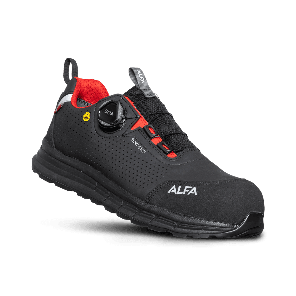 GLIMT AWS is a durable safety shoe made of maintenance- free Alfa Air® material. The shoes have a comfortable fit with fiberglass protective toe and soft nail protection. BOA® lacing system with protective shield facilitates individual adjustment. Antibacterial and moisture-wicking insole with extra shock absorption in heel and forefoot. EN ISO 20345. Class: S3, ESD, WRU, SRC.