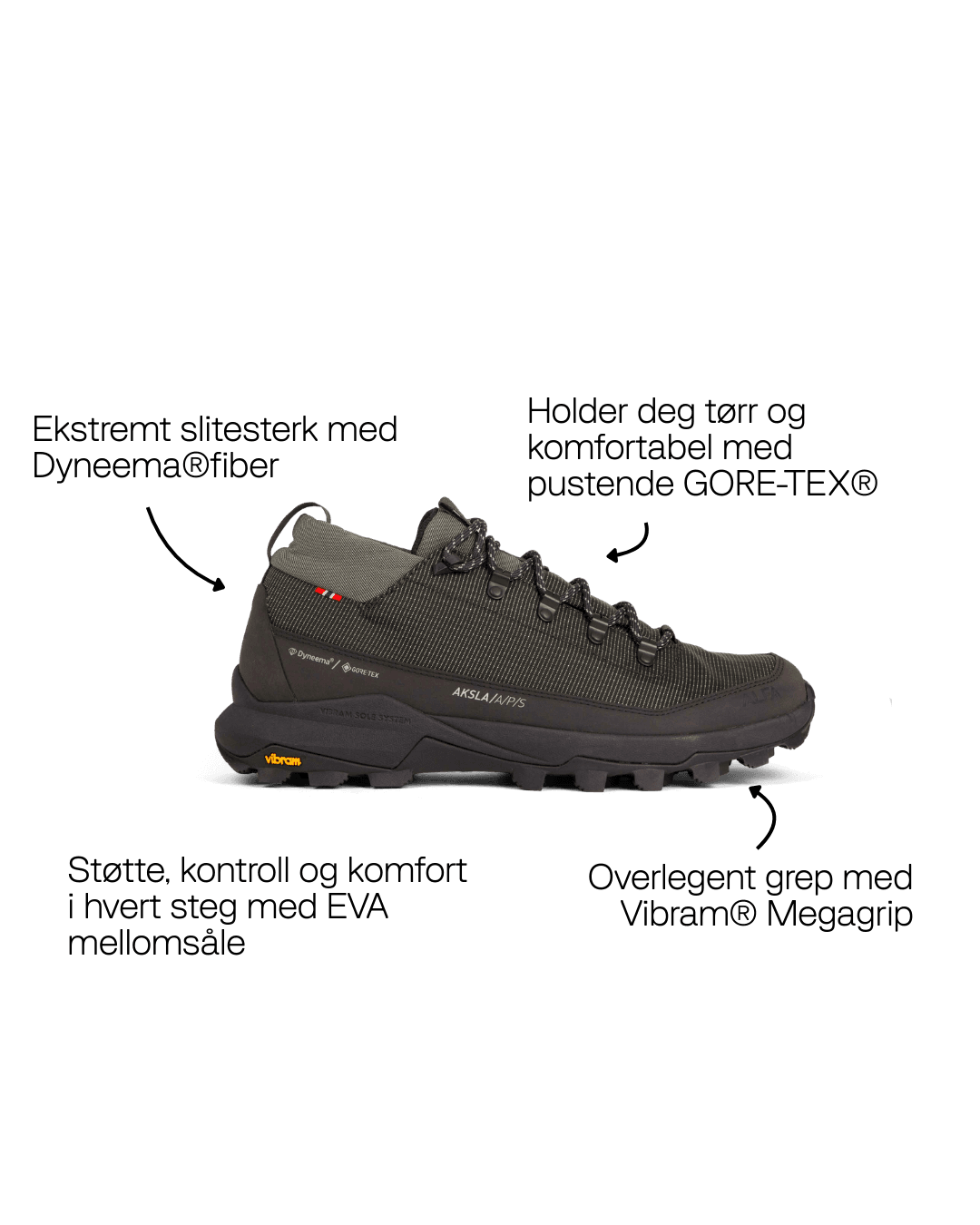 Med en vekt på kun 438 g (EU 43) gir Aksla den perfekte balansen mellom smidighet og beskyttelse. Vanntett GORE-TEX®, slitesterk Dyneema® og stabilt grep gjør den klar for lange turer og variert terreng.