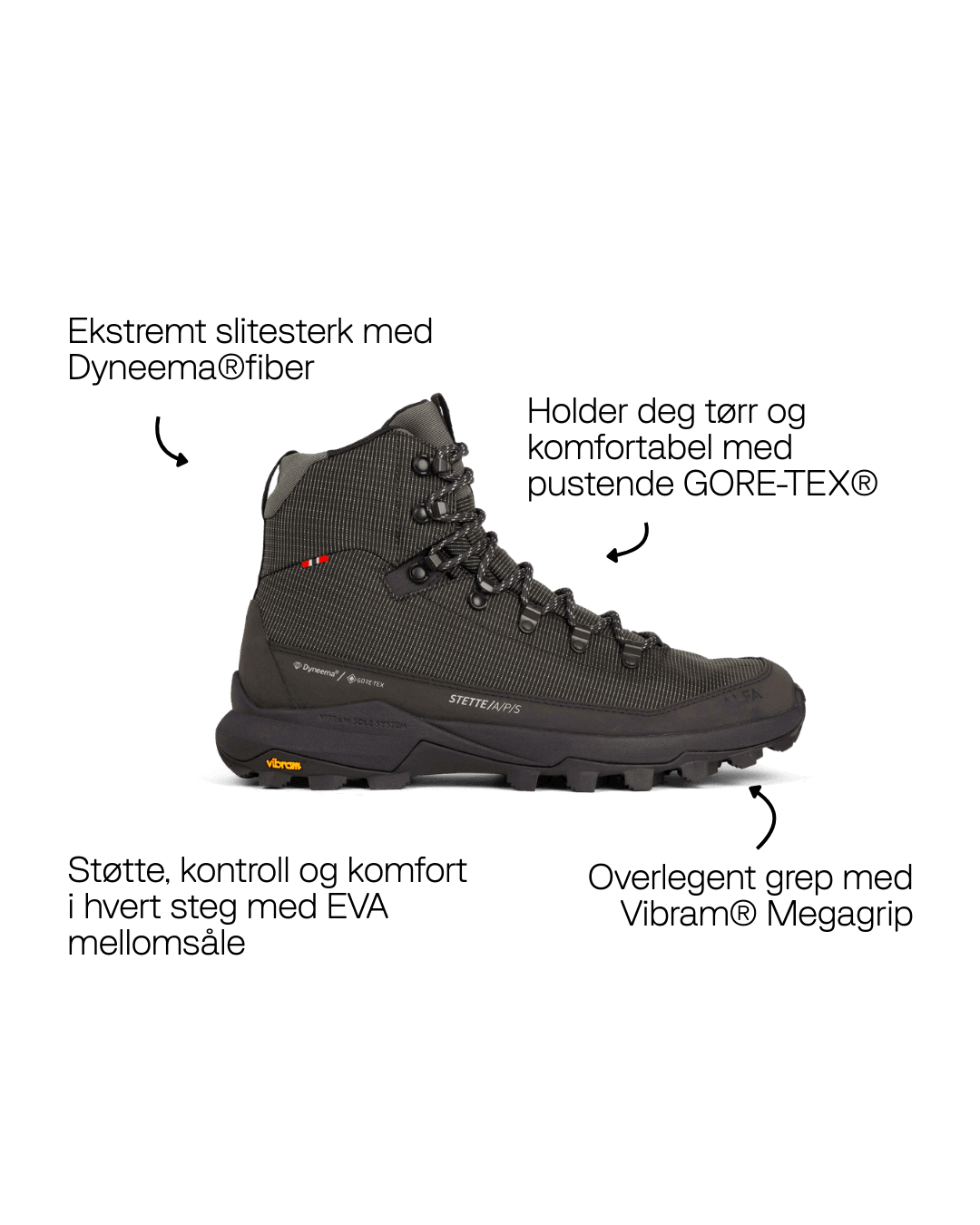 Dyneema® er en høyst innovativ fiber som er 15 ganger sterkere enn stål i forhold til vekt, samtidig som den er ekstremt lett og slitesterk. I Stette APS GTX M brukes Dyneema® i overdelen og i stretchgamasjen som omslutter ankelen. Resultatet er en sko som tåler utfordrende terreng, holder vann og smuss ute, og samtidig opprettholder et lett fotavtrykk — med forbedret holdbarhet.