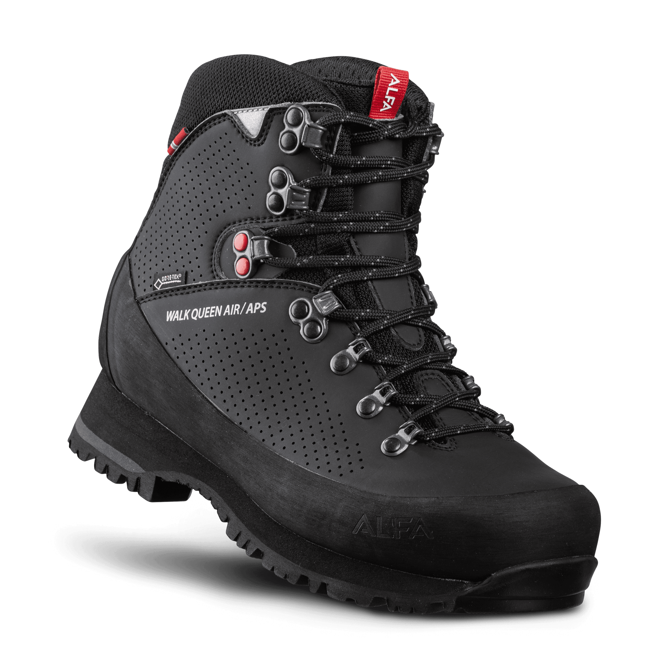 Ready for new adventures? Discover the ALFA Walk King Air A/P/S GTX – Women's This women’s hiking boot blends comfort, durability, and reliable grip – ideal for all kinds of terrain. The breathable Alfa-Air™ upper needs little maintenance, and the GORE-TEX® membrane keeps your feet dry all day. Memoryfoam and a soft collar add extra comfort, while the rubber mudguard protects against wear. The double lock lacing system makes it easy to adjust the fit. With a lightweight EVA midsole for cushioning and a Vibram® Grip A/M/G outsole for traction, you’re ready for any trail – rain or shine. Walk in comfort. Walk with confidence. Walk with ALFA.